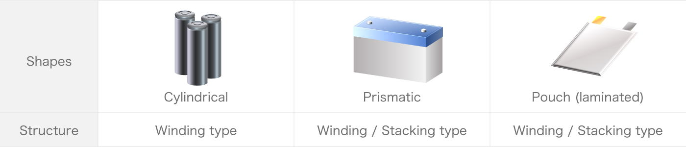 There are various types of LiBs, depending on their constituent parts such as electrodes and their shapes. Since the optimal inspection method differs for each type, the choice of inspection method is very important in LiB quality control. For example, the three most common battery shapes are "cylindrical", "square", and "pouch (laminated)". However, the internal inspection method using X-rays differs depending on the internal electrode structure (stacked or wound). The X-ray detector also varies depending on whether in-line or off-line inspection is used.