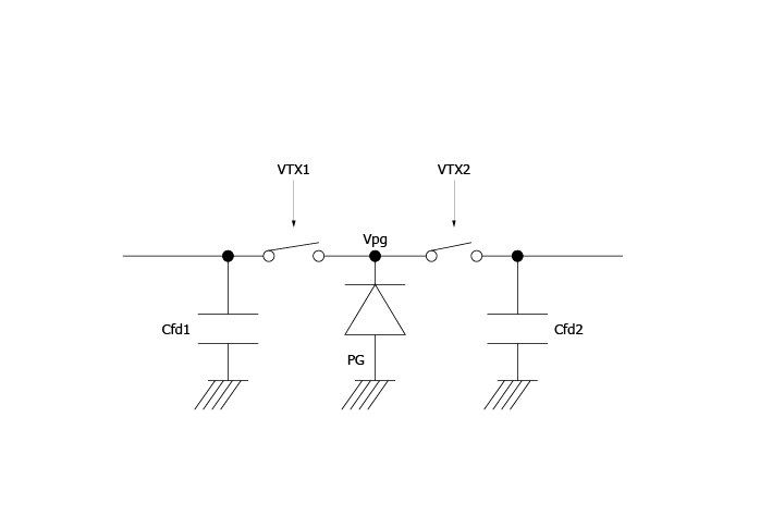 Pulses Vtx1 and Vtx2 are used to transfer generated electrons to two capacitance nodes (Vfd1 and Vfd2). From the accumulated charges in Q1 and Q2, and applying charge-to-voltage conversion, we obtain the output voltage Vout1 and Vout2: