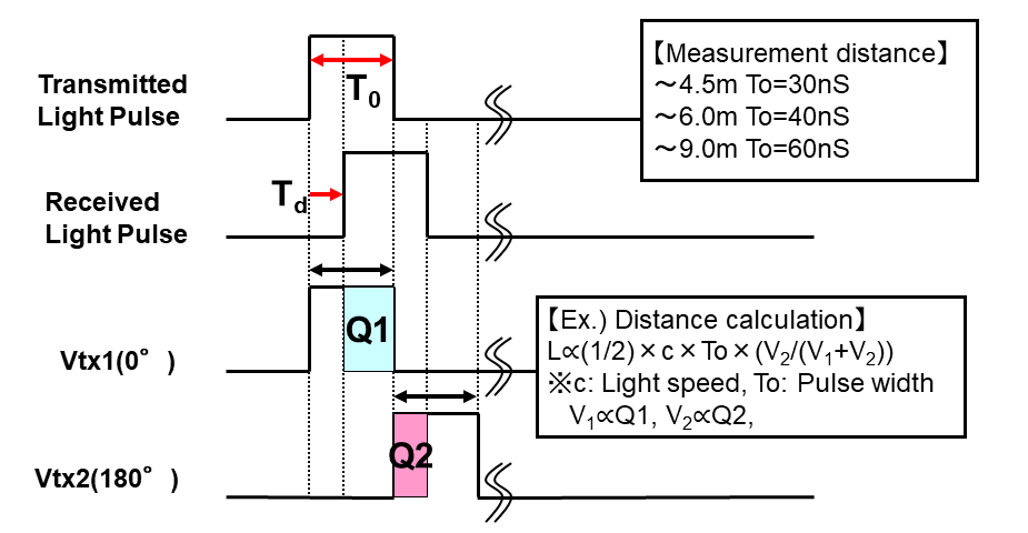 Figure 5 describes the direct ToF method. When we consider the phase difference information of light emitted and received, we are using the Indirect ToF method. In this method the charge generated in the photosensitive area is transferred to the storage section synchronously with the pulse of the light source, and the distance is calculated from the integrated charge.