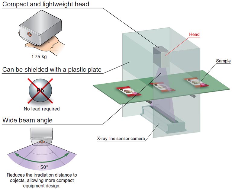 The L11754-01W emits soft X-rays (15 kV) that allow inspection of light-element foreign matter and impurities, which have been difficult up to now. Its compact and lightweight design with a wide beam angle enables easier installation and use in compact inspection equipment. A plastic plate can be used for shielding instead of lead, which helps reduce the cost of shielding.