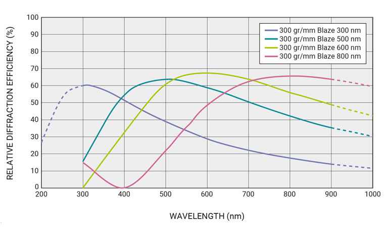 Relative diffraction efficiency simulated in a Littrow mounting with unpolarized light. The diffraction efficiency can vary significantly with the polarization of incident light. These data are obtained by simulated calculation, so this information is furnished for your information only. No warranty, expressed or implied, is created by furnishing this information.