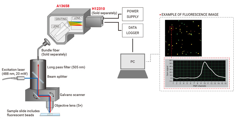 High sensitivity compact spectrometer A13658 is a polychromator for visible range that is specially designed to couple with 16 channel linear array multianode PMT series. Since a transmission type grating is used, it has higher efficiency and more compact size, compared to A10766.