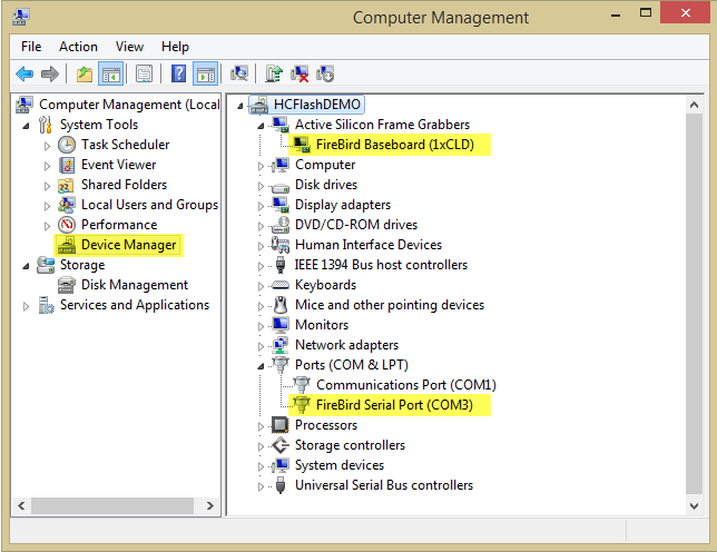 (Camera Link) The board is listed under Active Silicon Frame Grabbers as the FireBird Baseboard and under Ports (COM & LPT) as FireBird Serial Port (COM#). The camera make and model numbers are not displayed.