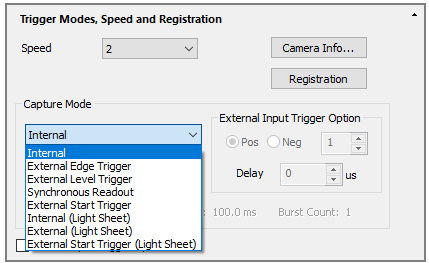 • (HCImage Live) Launch HCImage Live, expand Trigger Modes, Speed and Registration and verify the Capture Mode.
