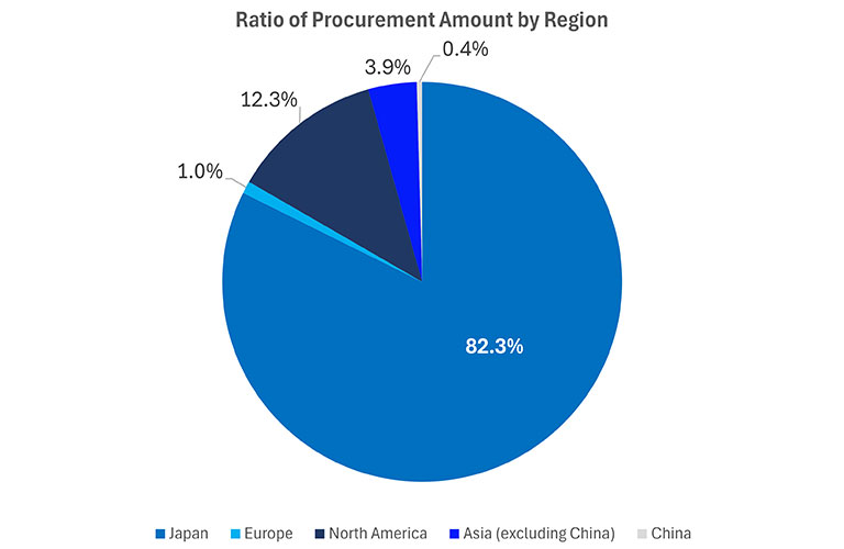 In terms of the amount spent on materials used in products by region, Japanese suppliers account for 82.3 % of the total, followed by North America (12.3 %) and Asia (excluding China) (3.9 %).