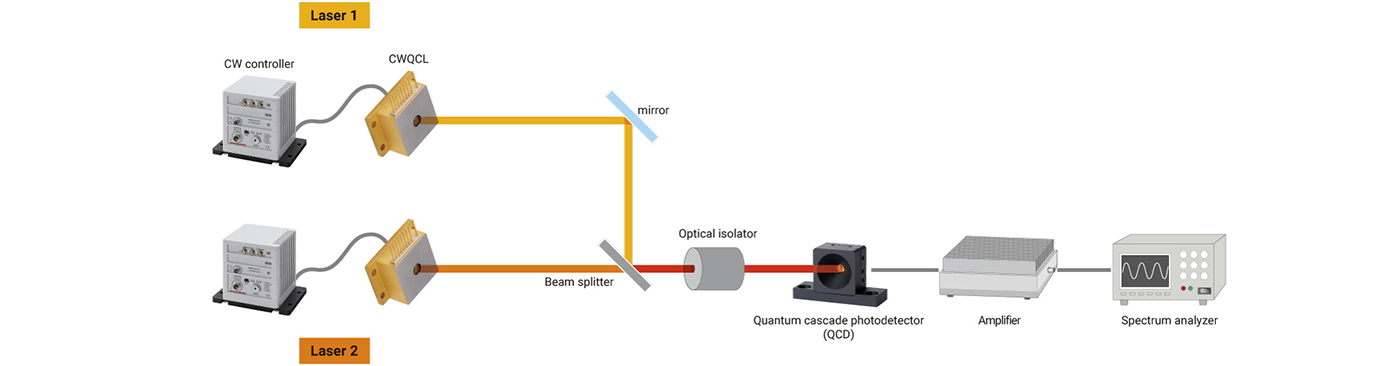 Hamamatsu photonics offers appropriate components to perform Heterodyne detection: QCD which has MIR sensitivity and high response feature, high stable QCL, and CW controller with ultra-low noise characteristic.