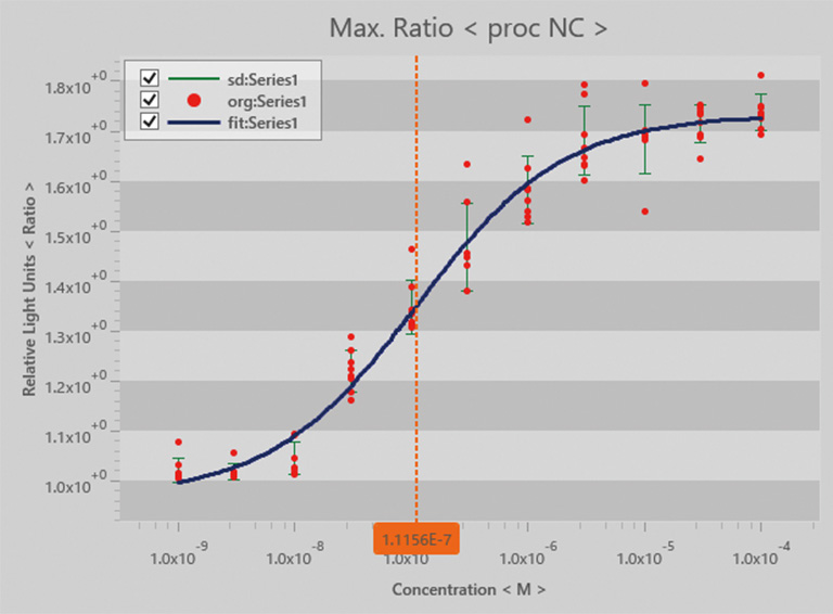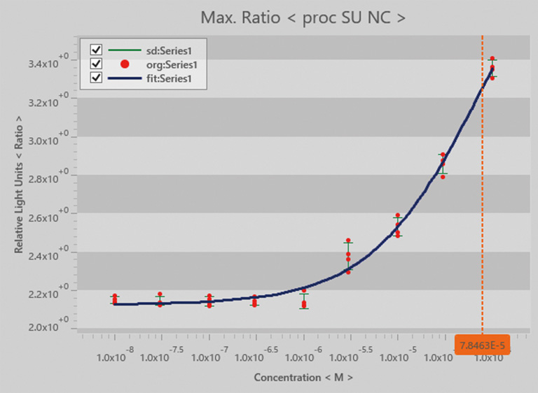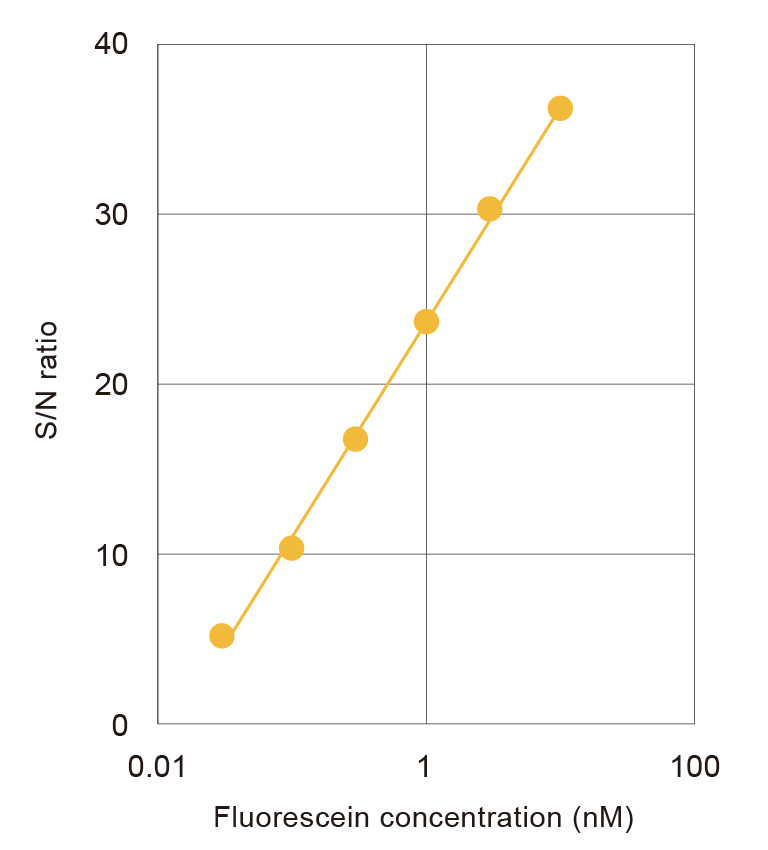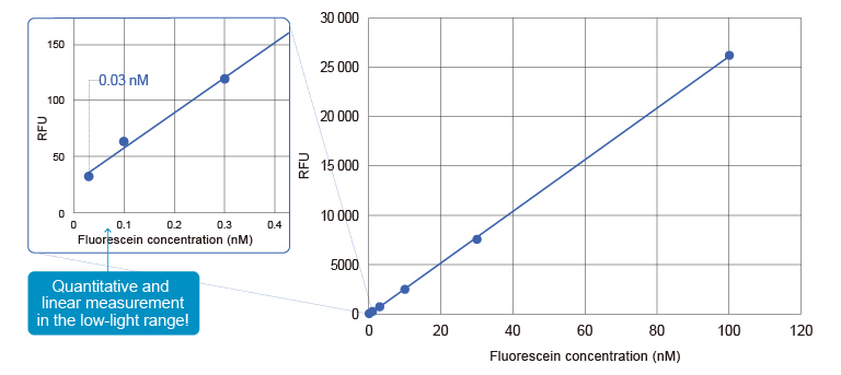 In fluorescence measurements, the FDSS-GX was able to detect 0.03 nM Fluorescein* (exposure time: 50 ms).
