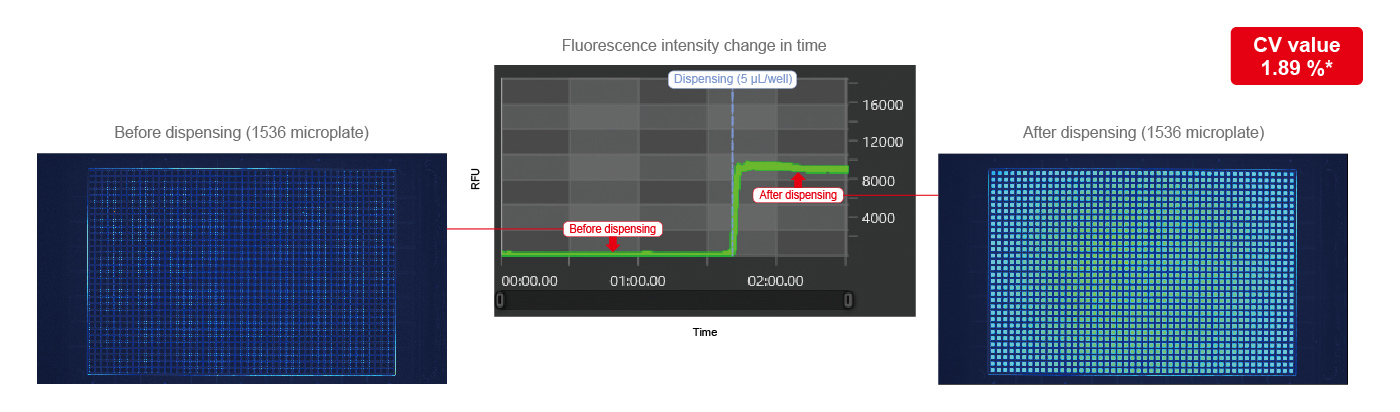 The figure below shows the fluorescence intensity change in time and plate image when B-beads were dispensed into a 1536 microplate (5 µL/well), showing a CV of 1.89 %* after dispensing.