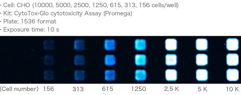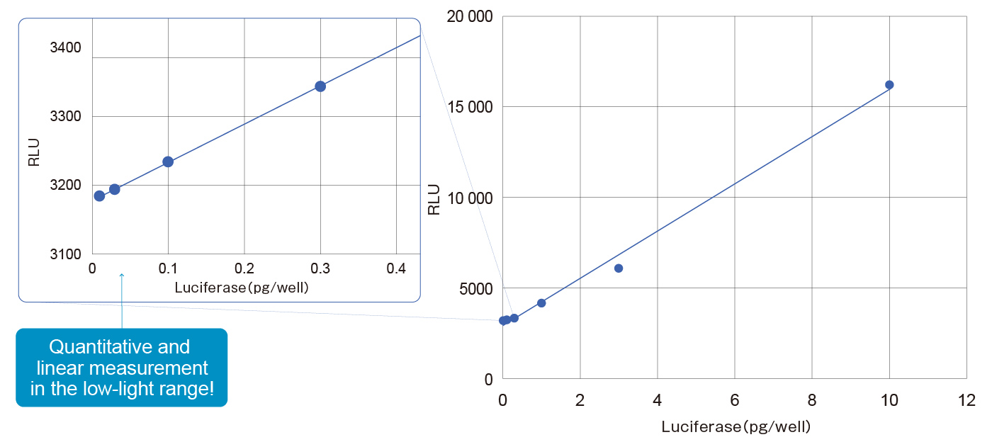 In luminescence measurements, the FDSS-GX was able to detect 3.9 fg Luciferase*(exposure time: 5 seconds) according to the calculations.