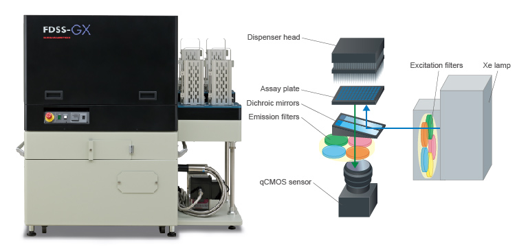 FDSS-GX is the highest-performance kinetic plate imager in the FDSS series, optimized for 96-, 384-, and 1536-well for reliable and stable high-throughput screening (HTS), enabling whole microplate imaging and simultaneous injections to all wells. This system achieves high-sensitivity imaging with qCMOS sensor, and highly accurate and repeatable micro-dispensing by adopting a 1536 ch dispensing unit capable of dispensing variable volumes. By combining optional parts, a robot-free semi-automation system can be built according to the user's purpose.