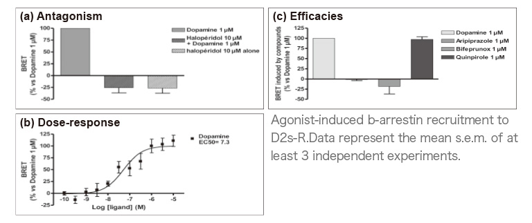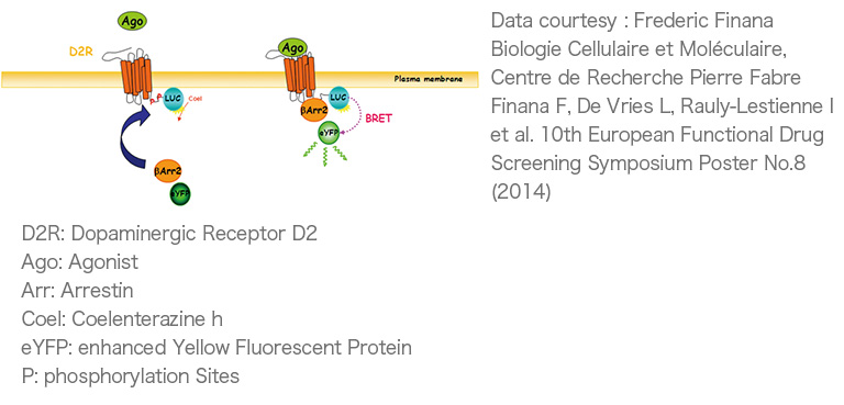 Rluc - D2s receptors and eYFP – β-arrestin 2 are expressed in CHO cells, and Rluc and eYFP BRET occurring in cells when Ligand is added are detected.