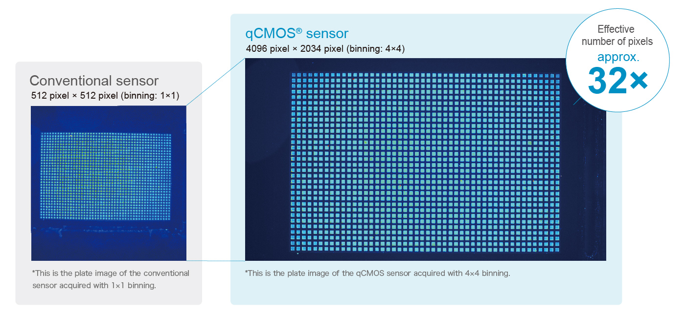 In addition, the qCMOS sensor makes it possible to image the whole plate due to the large sensor size, and enables high-resolution measurement.