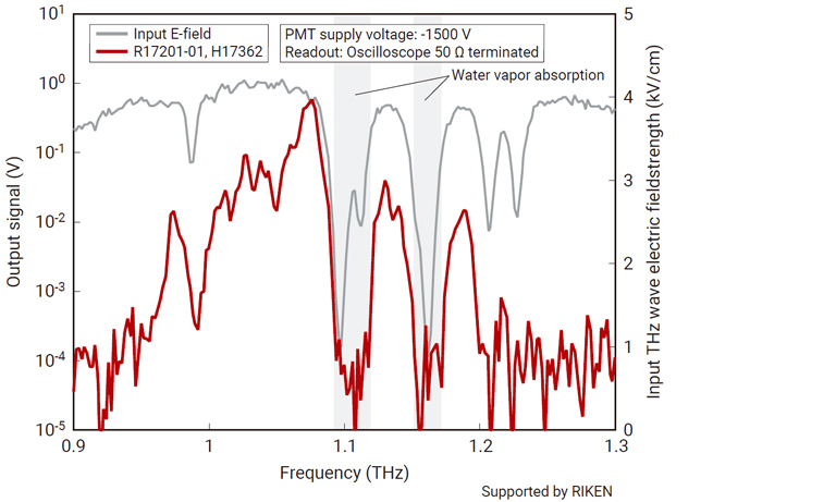 It can be seen that the incident THz wave attenuates at frequencies where absorption by water vapor occurs, and that the signal intensity of the THz PMT decreases accordingly.