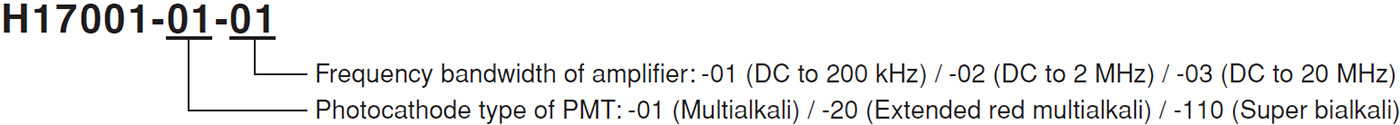 H17001-01 is the multialkali photocathode photomultiplier tube assembly that incorporates a metal package PMT, divider circuit and amplifier. The H17001-01 has an effective area of Φ8 mm and a spectral response range of 230 nm to 870 nm.