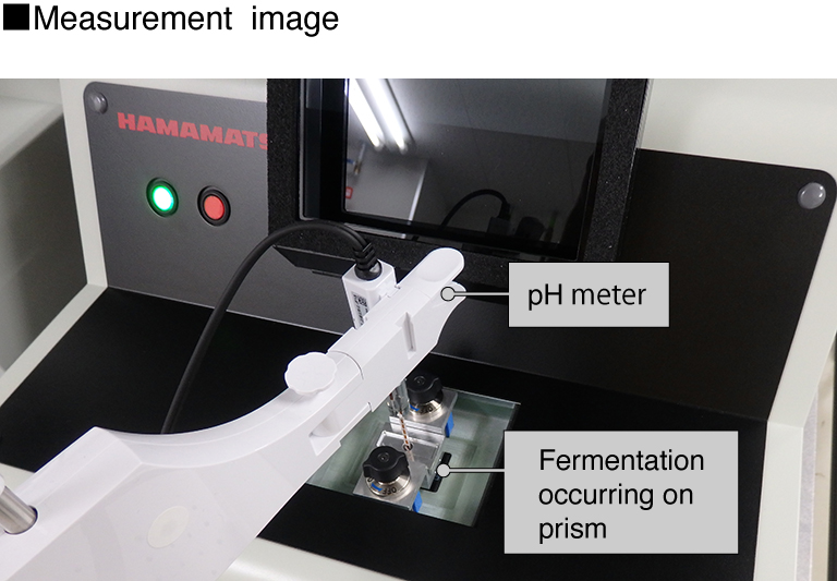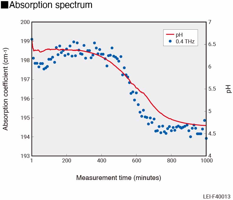 We measured the process of milk fermenting into yogurt while on a prism. This terahertz spectrometer ensures stable operation capable of measuring changes over time over a long period of time. We confirmed that absorption decreases the same way as changes measured with pH meters currently in use and that their inflection points match. Using terahertz waves in this way allows stable monitoring and measurement of the fermentation process.