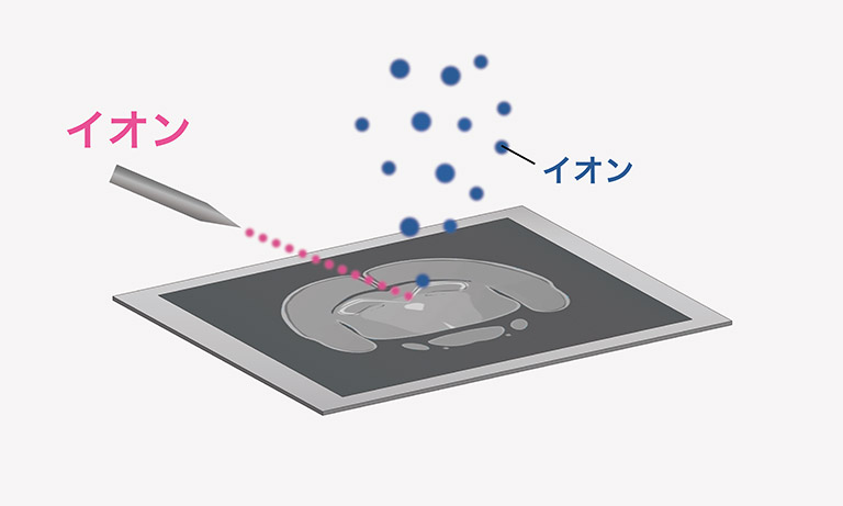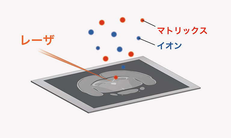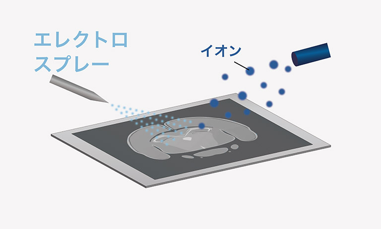 マトリックス支援レーザ脱離イオン化法 (Matrix-Assisted Laser Desorption Ionization, MALDI)は、現在最もMSIで用いられるイオン化法です。薄切サンプル表面にマトリックスというイオン化を支援する試薬を塗布し、UVレーザを局所的に照射します。マトリックスがレーザを吸収しながら試料の脱離・イオン化を補助することで、分子を壊さずにイオン化することができます。MALDIは飛行時間型 (time-of-flight, TOF)質量分析計、もしくは四重極飛行時間型 (quadrupole time-of-flight, QTOF)質量分析計と組み合わされることが一般的です。
