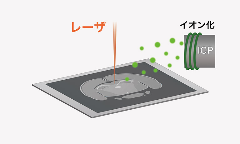 レーザアブレーション誘導結合プラズマ質量分析 (LA-ICP-MS)は、試料表面にレーザ光を照射し、蒸発・微粒子化した試料をICP-MSに導入します。試料はICP-MS内で原子状態まで分解されるため、各元素のイメージが得られます。バイオサイエンスにおいては生体試料中の微量金属元素の解析などに用いられています。