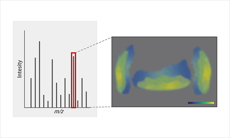 試料を局所的に脱離・イオン化させ、クロマトグラフィーを介さず質量分析装置に直接導入してマススペクトル (相対質量電荷数比 m/zとその強度のプロット)を取得します。この局所的なプロセスを試料全面で走査することで、1ピクセルごとにマススペクトルを保有したデータセットが得られます。