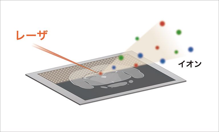 MSIの測定機能は、質量分析装置のオプションとして用意されており、得られる結果は装置仕様に依存します。例えば、高い質量分解能をもつ装置であれば、MSIの結果も同様に高い質量分解能で得られます。また、MSIでは数~数十μm程度の分解能でイオンイメージ (分子分布)を得ることが一般的です。分解能に寄与する測定パラメータは手法によって変わりますが、レーザ脱離イオン化法であれば、レーザ照射径と照射ピッチを目的に応じて調整します。