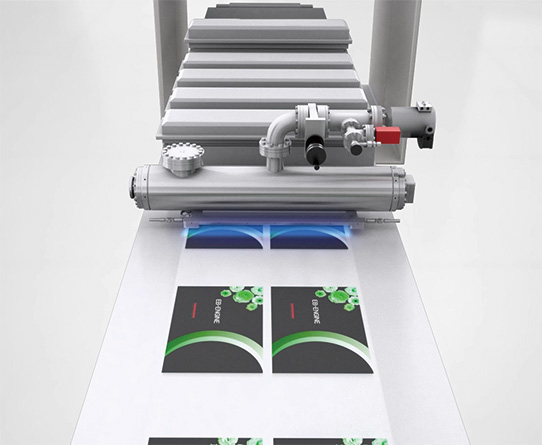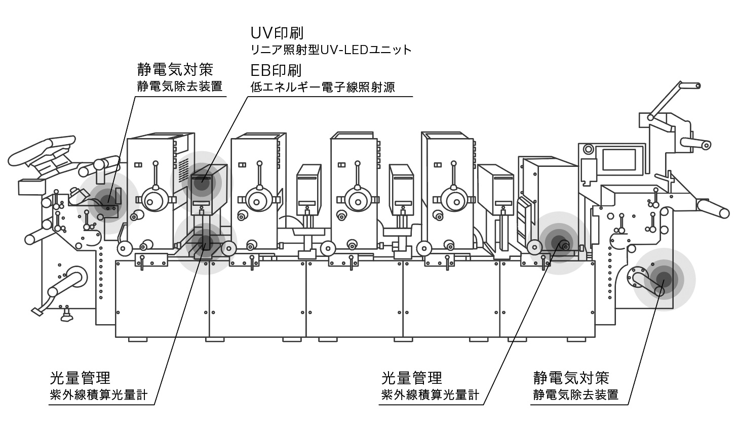 電子線(EB)を照射することによって、EBインキをはじめとするラジカル重合系インキを瞬時に乾燥する印刷方式です。低エネルギー電子線により、効率的なEBインキの乾燥を可能にします。