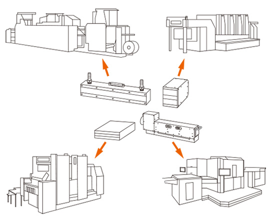 形状や性能といった要素において、インクジェット方式やフレキソ方式など、さまざまな印刷機との適応性を高めたUV-LED光源を提案します。UV-LED光源の搭載(置き換え)の簡易化をはじめ、タクトアップ・高い操作性・高い信頼性を実現します。