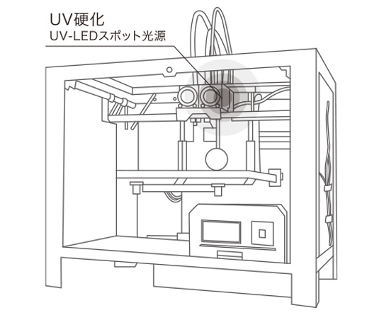 小型LEDヘッドにより、UV樹脂・UV接着剤のポイント硬化を可能にします。空冷方式を採用した小型軽量なボディは、3Dプリンタなどの各種装置に対して自由な発想での取付方法を検討いただけます。3Dプリンタの高性能でコンパクトな装置設計に貢献します。