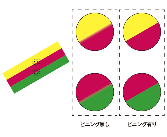 デジタルUV印刷における「ピニング」とは、プリントヘッドの直後に低出力のUV光を照射し、インク液滴の広がりを抑える工程です。ピニングを行わない場合、インク液滴が広がって境界がぼやけたり、隣接する液滴と混ざり合ってしまい、画質のシャープさが損なわれることがあります。