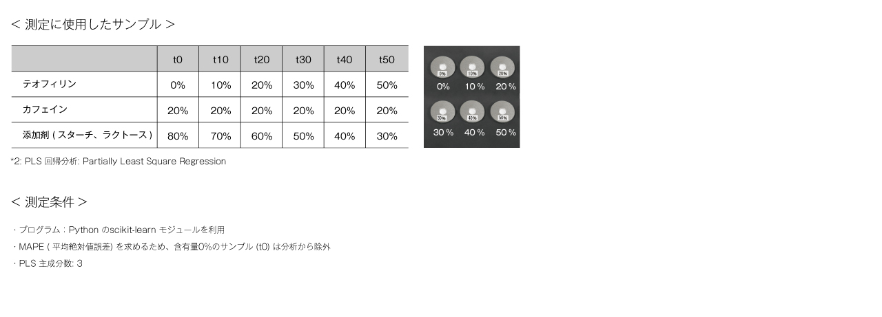 事前に取得したトレーニングデータ*3 から検量線を作成し、PLS 回帰分析することで、テオフィリン含有量を予測しています。