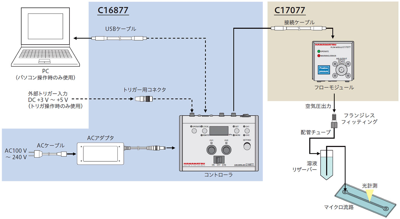 C16877-01, C17077-01/-02は定圧制御で空気の加圧/減圧が可能なフローコントロールユニットです。