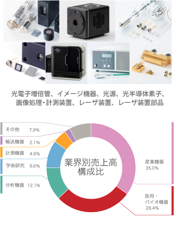 光電子増倍管、光半導体素子、各種光源といった高性能デバイスから画像処理・計測機器、レーザ装置まで様々な製品を、医用、産業、分析、計測、学術研究など幅広い分野に供給しています。