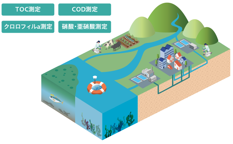 安全な生活水を支える水質評価は川、湖、海の環境保全にもつながります。水質評価にはさまざまな測定項目があり、当社の光源・光センサは窒素化合物、炭素量 (TOC)、酸素量 (COD)、クロロフィルaの測定などに使用されています。