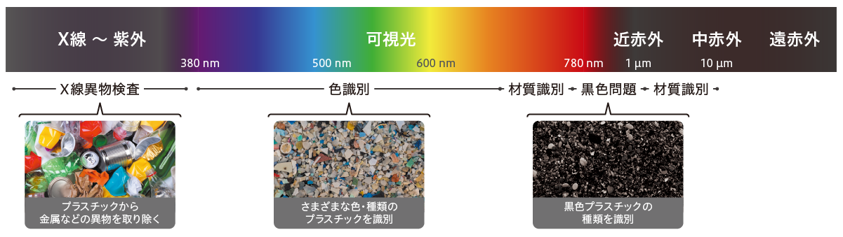 さまざまな種類のプラスチックの選別や異物の識別に、X線・近赤外・中赤外・テラヘルツによる光センシング技術が活用されています。