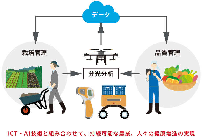 「スマート農業」の発展に向けて、植物情報のセンシングが重要です。植物の情報、例えば、体内の水分や成分の量、生育リズムなどを光技術によって捉え、植物が『今』どのような状態にあり、何を求めているかを推測することで、適切な施肥や資材の投入、収穫物の価値向上と同時に、環境へ配慮した農業の実現への貢献を目指しています。