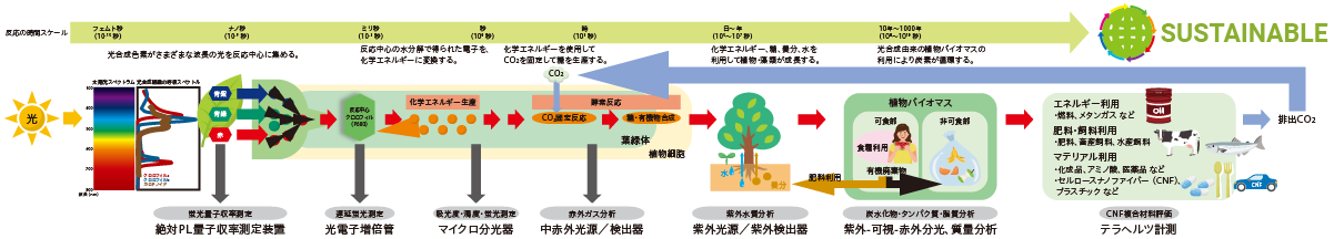 地球上のバイオマス (生物量)の80 %以上は、光合成による二酸化炭素吸収に由来すると言われています。カーボンニュートラル実現に向けてバイオ資源を利用する技術が研究されており、光合成プロセスの評価に向けたさまざまな光技術の応用が期待されています。