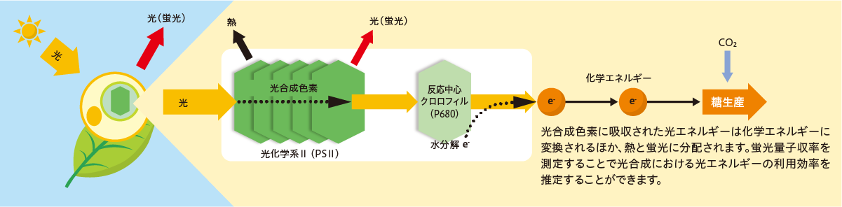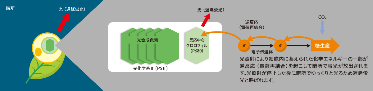 光合成においてクロロフィルに吸収された光エネルギーは化学エネルギーに変換され、CO2固定などのバイオ資源生産に必要な生化学反応に利用されます。この化学エネルギーの一部が逆反応を起こすとクロロフィルからフォトンが発生します。