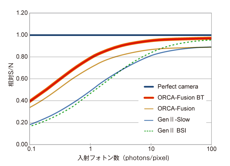右グラフは読み出しノイズが無く、量子効率が100 %のカメラ(Perfect camera)のS/Nを1とした場合の相対的なS/Nを示しています。また暗電流ノイズが無視できる露光時間の場合での値を示しています。