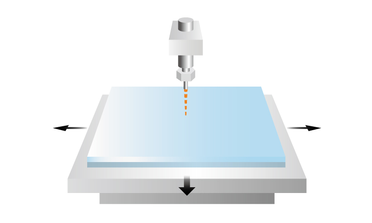 レーザアブレーションにより、ガラス基板またはウェーハ上の回路パターンを切除します。回路パターンなどを切除することで、チップ1つ1つの抵抗値を調整することができ、製品の性能向上に貢献することができます。