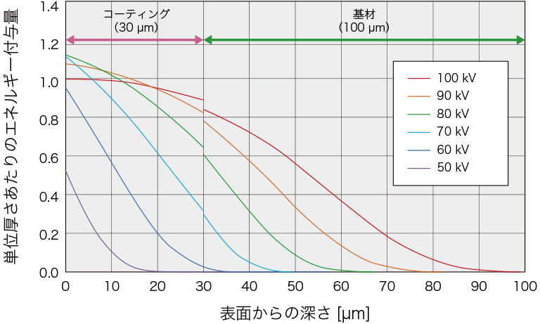 電子線が材料の深さ方向にどの程度エネルギーを与えるかを予測できます。これにより、改質したい層に最適な加速電圧・照射距離を算出可能です。