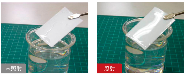 電子線を照射していない樹脂は見た目に変化がありませんが、照射した樹脂では光沢が見られ、グラフト重合が進んだことがわかります。