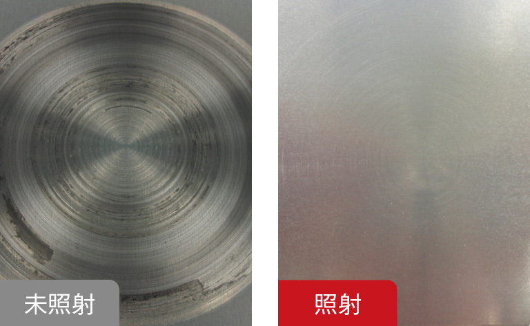 電子線を照射していない樹脂には研磨による摩耗の後がついていますが、照射した樹脂にはほとんど痕がついていません。