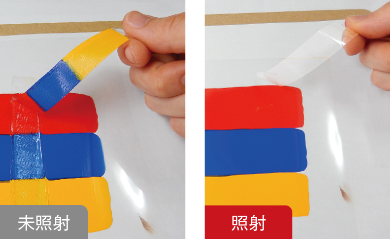 電子線の照射前はテープにインキが付着していますが、照射後はインキが硬化し基材に密着したことで、テープに付着しません。