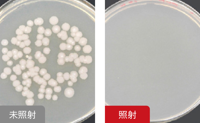 電子線を照射していないシャーレの枯草菌は増殖していますが、照射したシャーレの枯草菌は増殖していません。