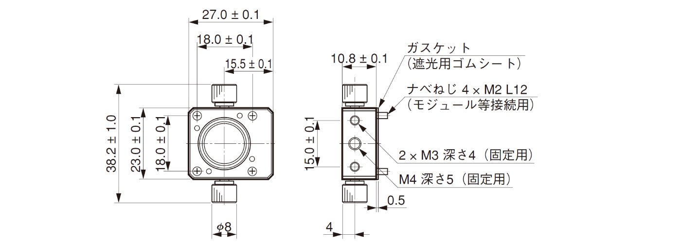 光電子増倍管モジュールと各ブロックを接続するためのアダプタです。 アダプタブロックには、光学実験台や光学ステージに固定するためのM4とM3のねじ穴があります。M4のねじ穴には、ミニポストを取り付けることができます。