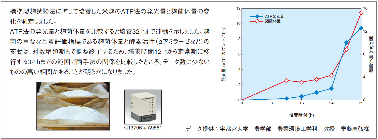 米麹培養中のATP法の発光量と麹菌体量の変化