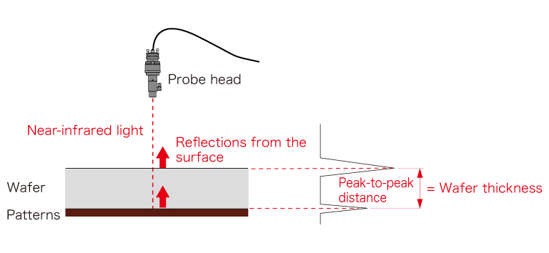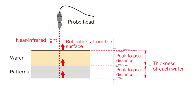The probe head irradiates the sample with near infrared light which reflects back from the front surface of the film. Some of the light transmits through the film and reflects back from the boundary on the opposite side. The controller internally processes each reflected light to detect the position on the film boundary where light was reflected. The controller then calculates the film thickness from the distance between the detected peaks.