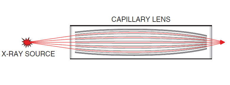 The J12818-01 focusing capillary lens is a focusing optics for X-rays, consisting of a bundle of numerous hollow glass capillaries formed into a cylindrical shape with its ends gently tapered. This product utilizes total reflection of X-rays on the inner wall of each capillary to focus X-rays emitted from an X-ray source to a small spot.